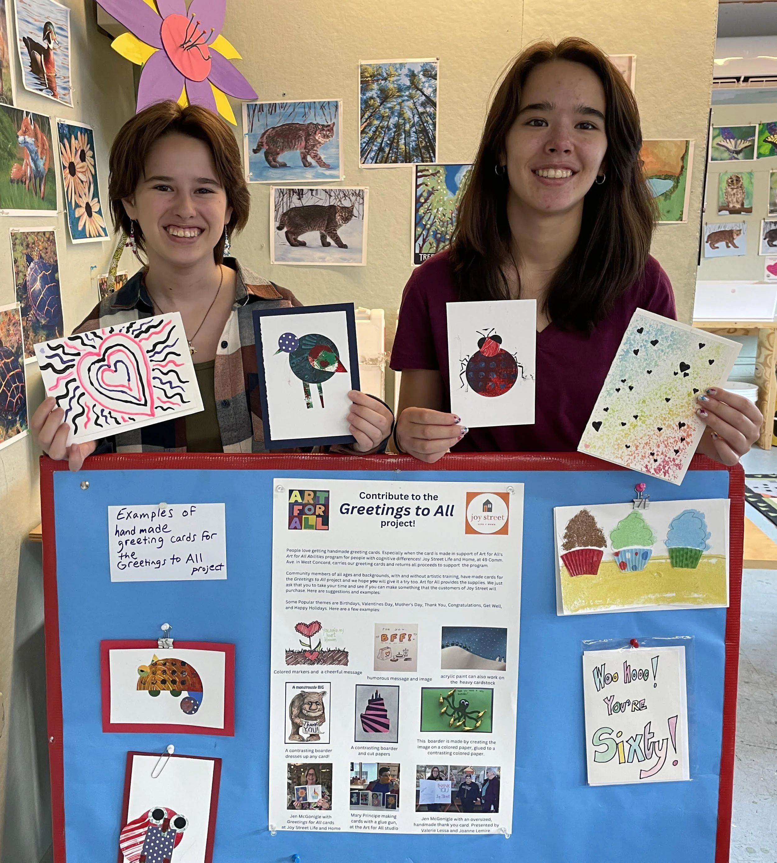 Alyssa, Christina and their mother Kimber-Lynn Drake have been fabulous volunteers for Art for All for several years. Alyssa and Christina, both students at Concord Carlisle High School, breathed new life into our Greetings for All project. They are doing much of the organizational work that all creative projects need to flourish. Thank you Drakes!
