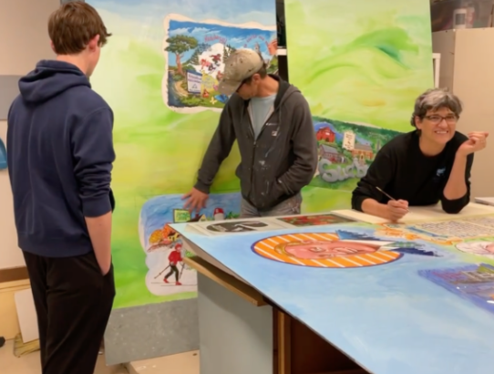 Mike told Andrew Gilmore (CCHS student) how to paint over the border of Chris Price’s painting of Carlisle, while Susan Ward worked on repairing lettering that had smeared when the painting was glued down.