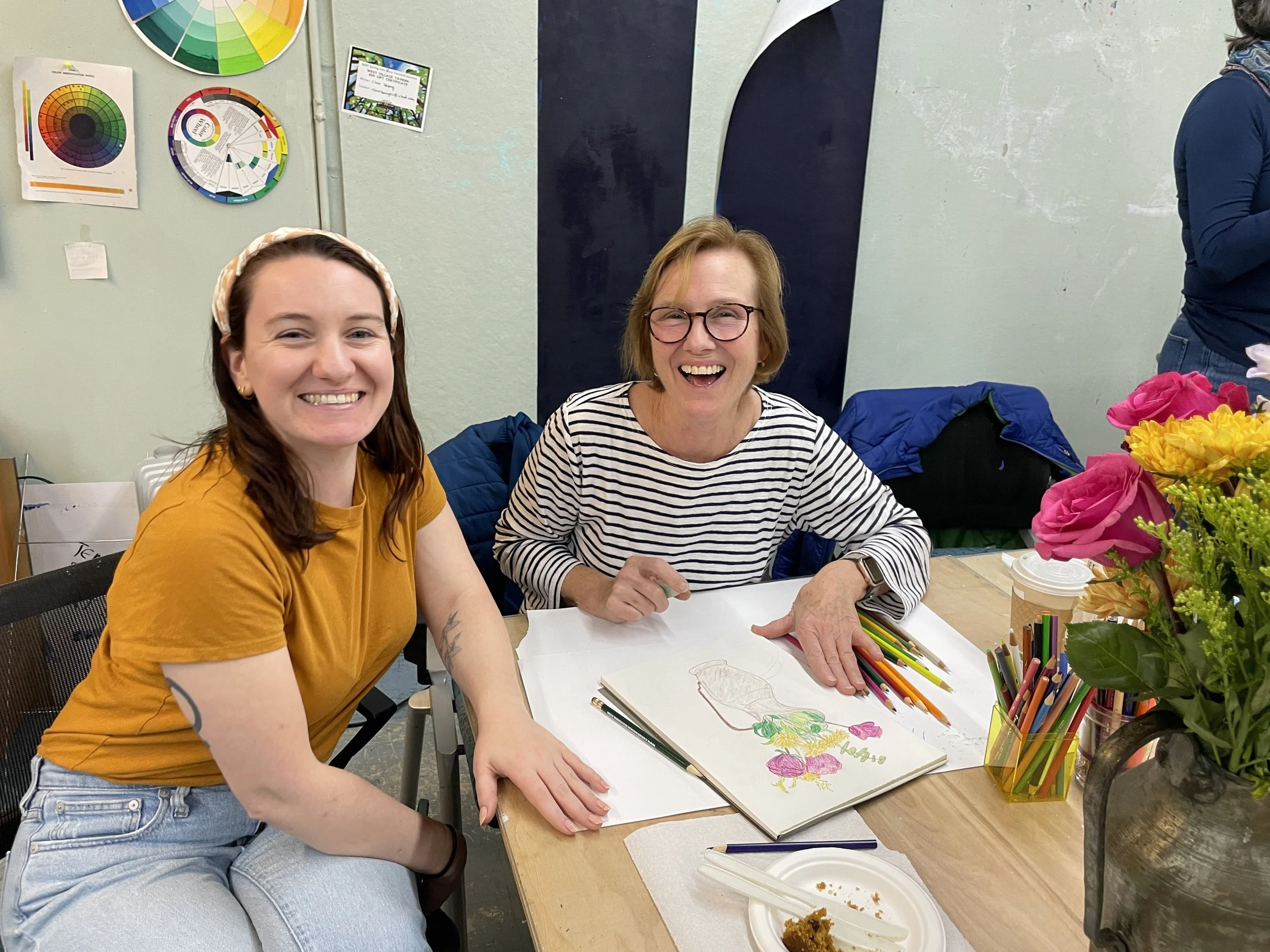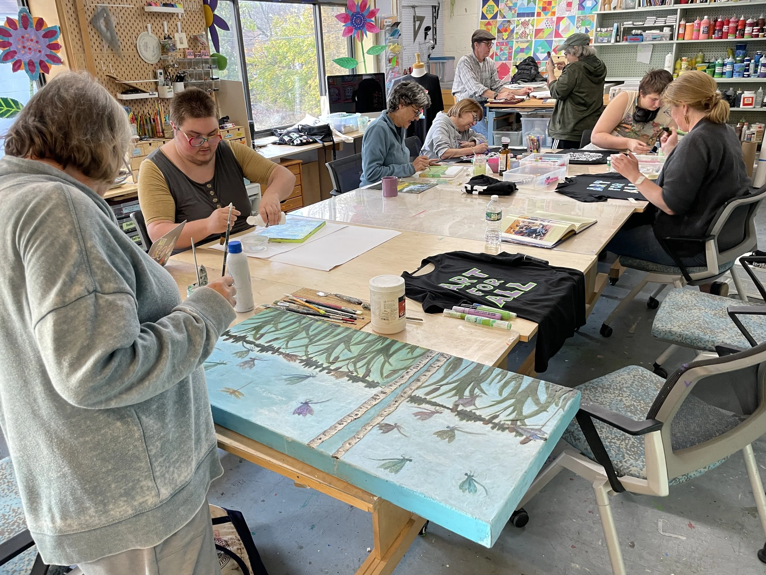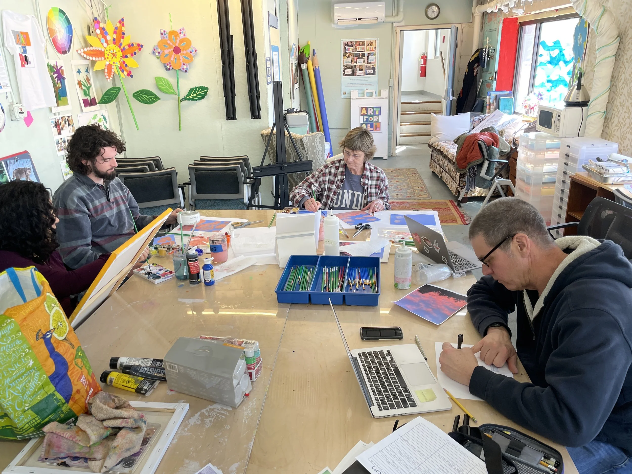 The studio is open during this time for people who enjoy working creatively in community. Studio equipment and many supplies are available to use. Some people bring their own project to work on, typically a drawing or painting. Others contribute to an AfA community art project. Sometimes we have a collaborative mural or display going on. Sometimes we are working on products such as greeting cards or t-shirts to sell to support AfA programs.