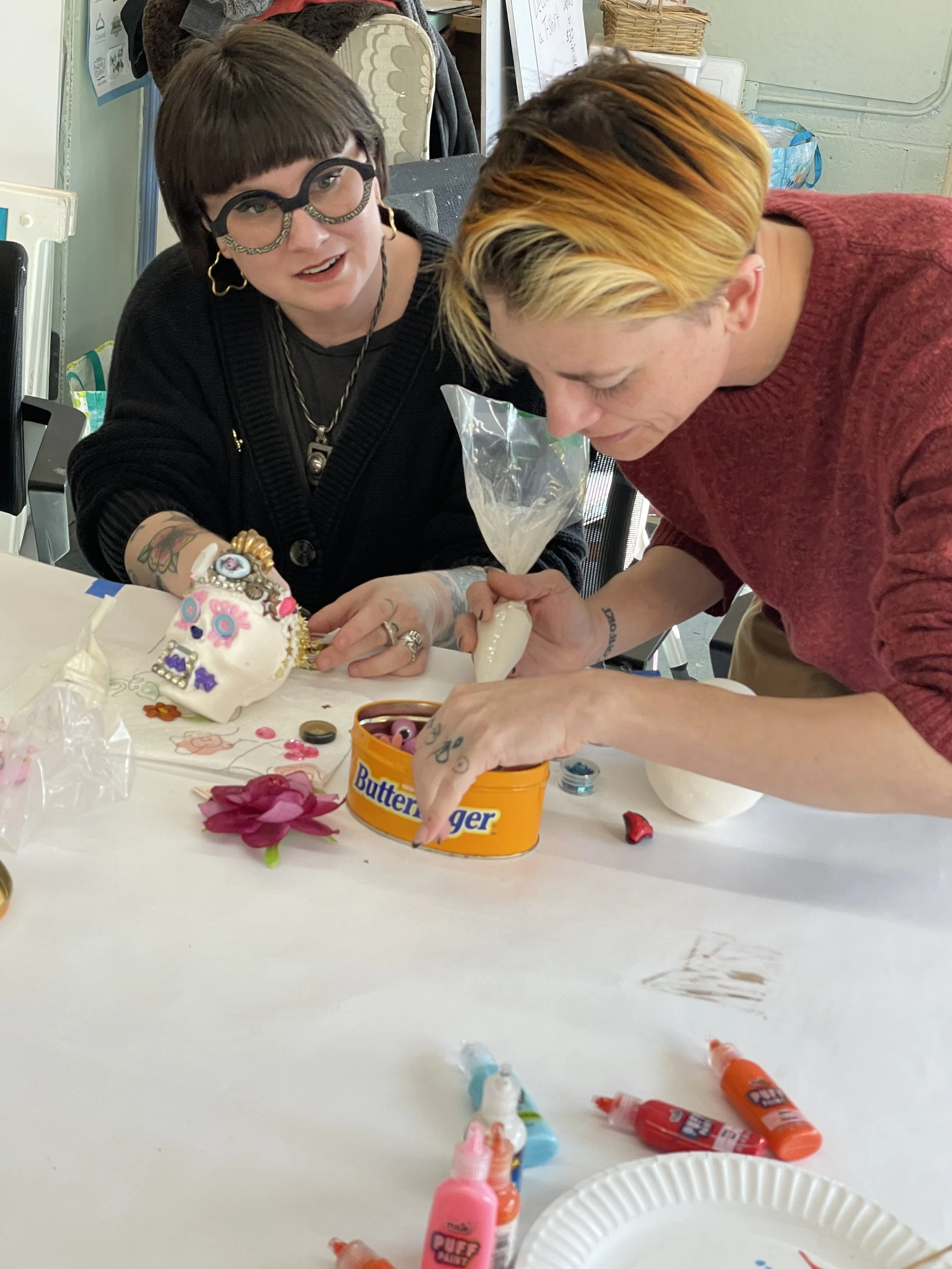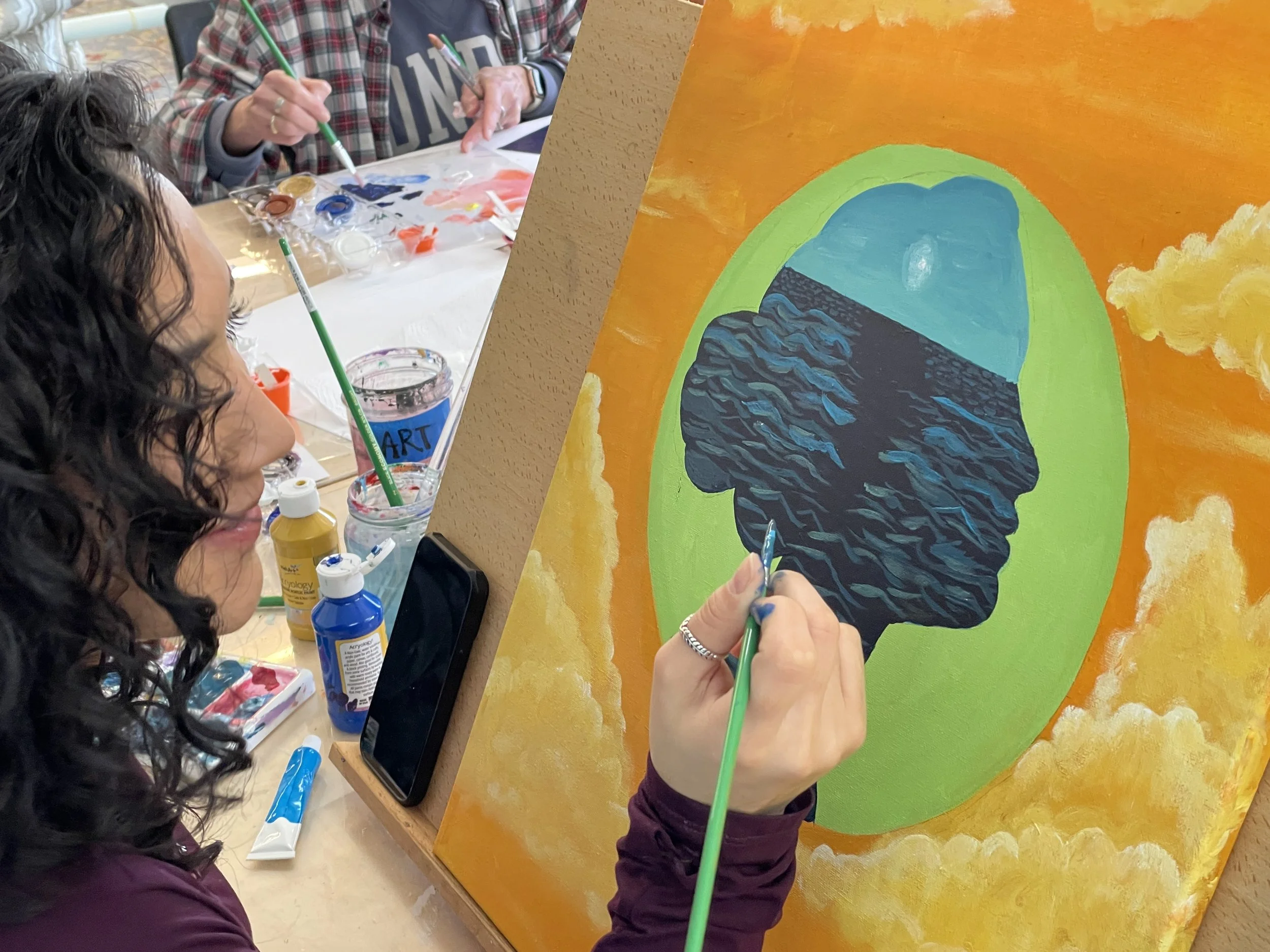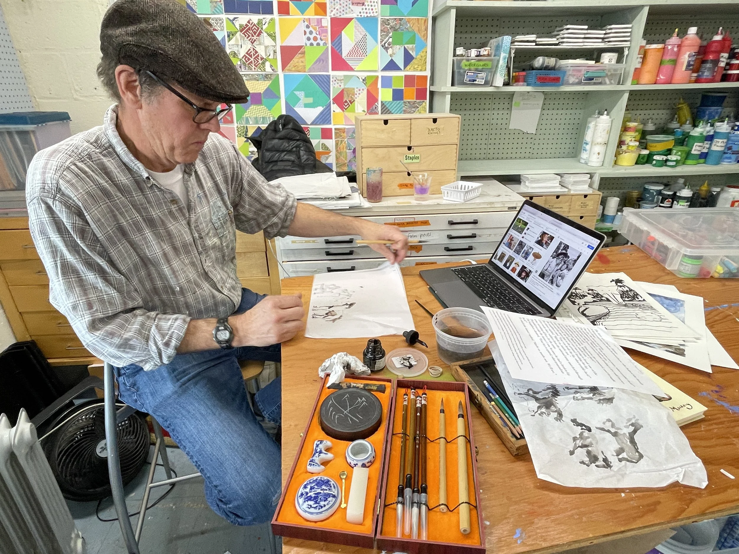 The studio is open during this time for people who enjoy working creatively in community. Studio equipment and many supplies are available to use. Some people bring their own project to work on, typically a drawing or painting. Others contribute to an AfA community art project. Sometimes we have a collaborative mural or display going on. Sometimes we are working on products such as greeting cards or t-shirts to sell to support AfA programs.